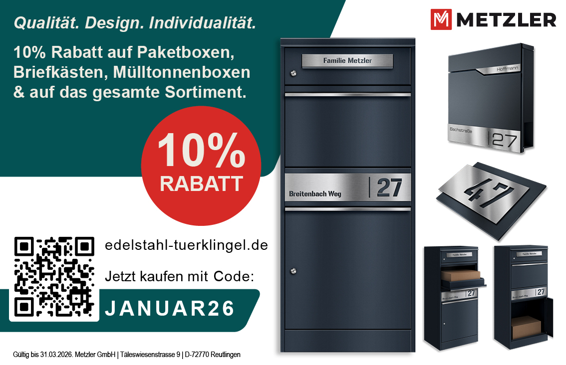 10% Rabatt auf Paketboxen, Briefkästen, Mülltonnenboxen & auf das gesamte Sortiment. Qualität. Design. Individualität.