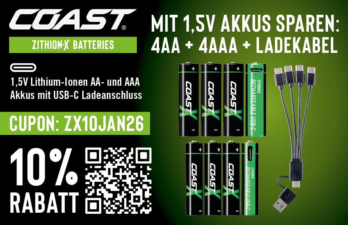 10% RABATT | COAST. ZITHION-X BATTERIES MIT 1,5V AKKUS SPAREN: 4AA + 4AAA + LADEKABEL Lakuda ApS Startdatum 20.01.2026 Ablaufdatum 31.12.2026 1,5V Lithium-Ionen AA- und AAAAkkus mit USB-C Ladeanschluss #haus&garten Code ZX10JAN26 Couponcode kopieren Coupon einlösen Coupon drucken! Endet in