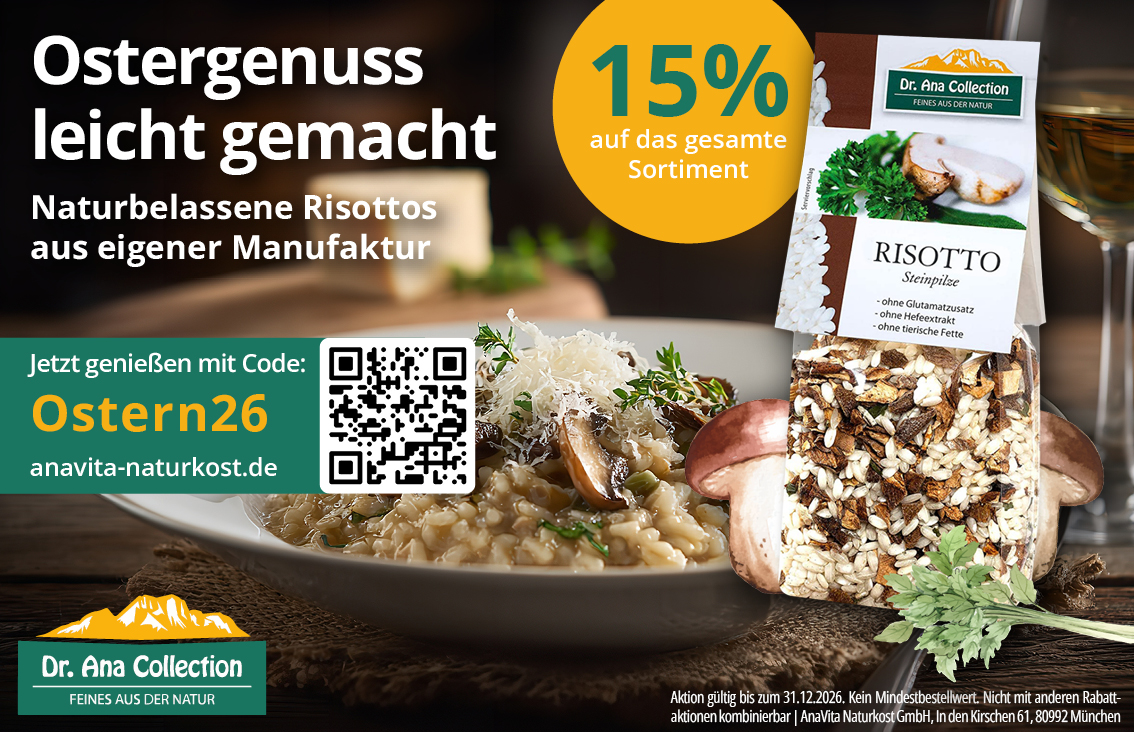 15% auf das gesamte Sortiment | Ostergenuss leicht gemacht! Naturbelassene Risottos aus eigener Manufaktur AnaVita Naturkost Startdatum 20.03.2026 Ablaufdatum 31.12.2026 Code Ostern26 Couponcode kopieren Coupon einlösen Coupon drucken! Endet in
