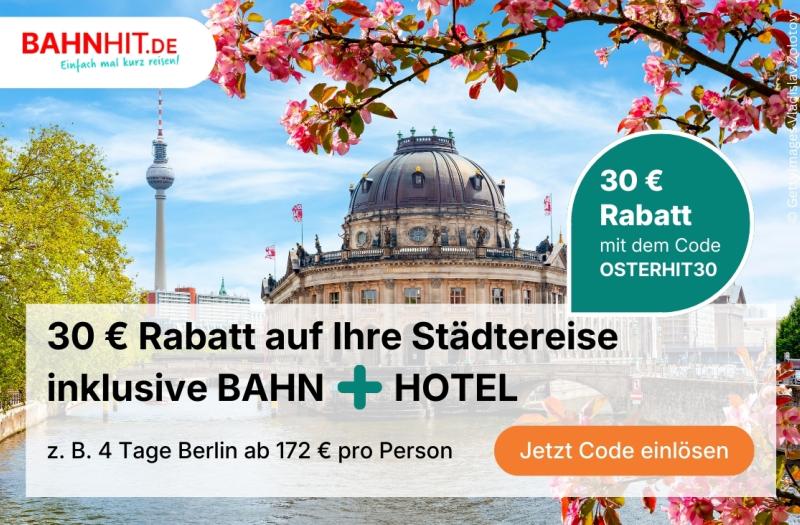 30 € Rabatt auf Ihre Städtereise inklusive BAHN + HOTEL | z. B. 4 Tage Berlin ab 172 € pro Person Mehr Details Endet in