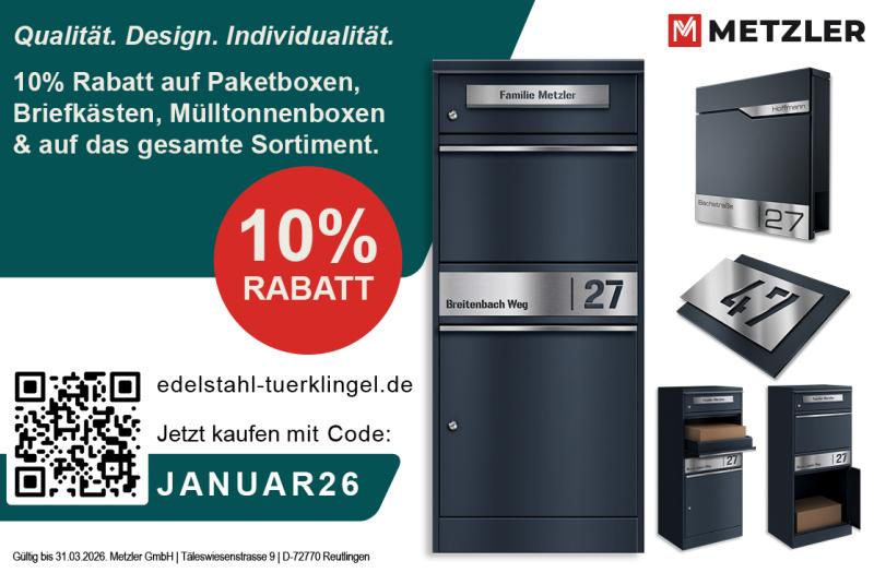 10% Rabatt auf Paketboxen, Briefkästen, Mülltonnenboxen & auf das gesamte Sortiment. Qualität. Design. Individualität. Mehr Details Endet in
