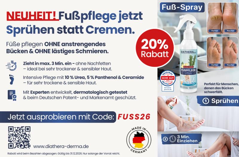 20% Rabatt | NEUHEIT! Fußpflege jetzt Sprühen statt Cremen. Füße pflegen OHNE anstrengendes Bücken & OHNE lästiges Schmieren. Mehr Details Endet in