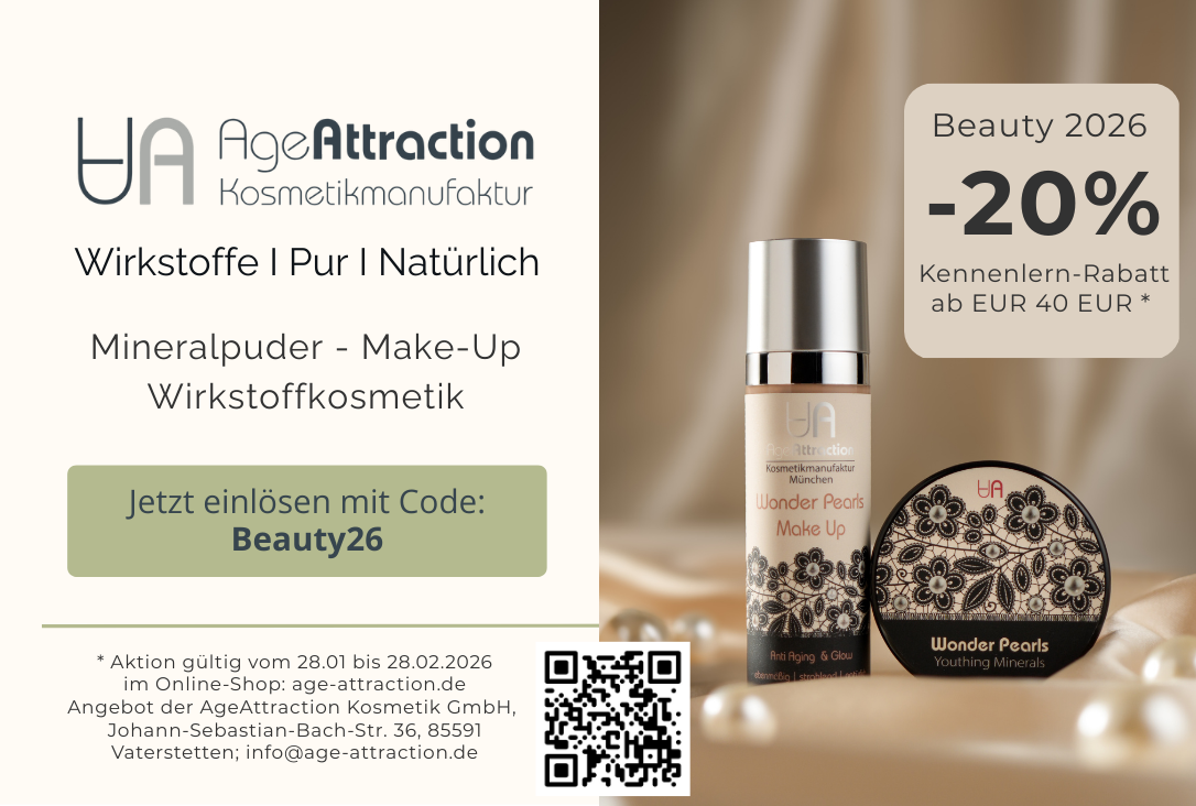 Mineralpuder Make-Up Wirkstoffkosmetik Hautpflege die begeistert! -20% Kennenlern-Rabatt ab EUR 40 EUR * AgeAttraction Kosmetik Startdatum 28.01.2026 Ablaufdatum 28.02.2026 Aktion gültig vom 28.01 bis 28.02.2026 im Online-Shop: age-attraction.deinfo@age-attraction.de #wellness&beauty Code Beauty26 Couponcode kopieren Coupon einlösen Coupon drucken!