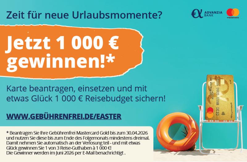 Zeit für neue Urlaubsmomente? Jetzt 1.000 € gewinnen!* Karte beantragen, einsetzen und mit etwas Glück 1 000 € Reisebudget sichern! Mehr Details Endet in